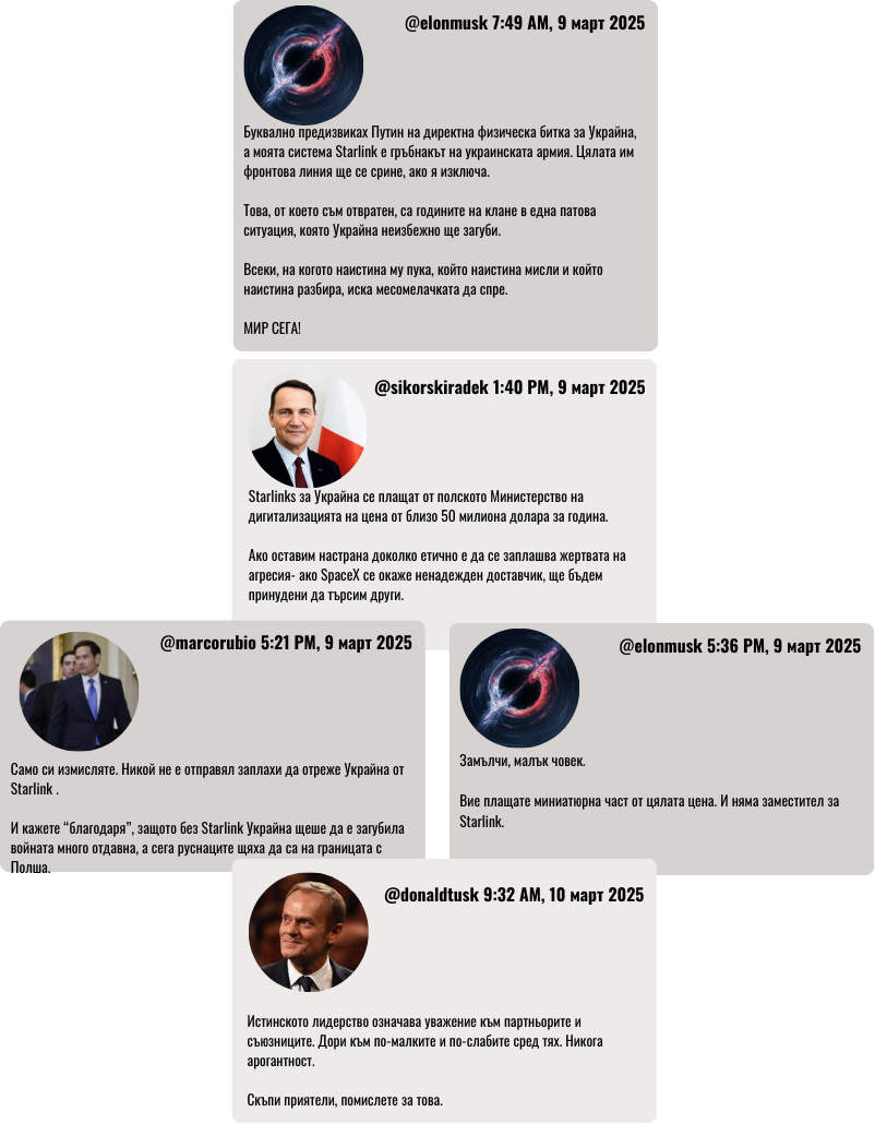 Няколко минути по-късно и след двусмислени подмятания за това, че може да съсипе Украйна, в случай че спре Starlink, Мъск беше заставен да удостовери, че.