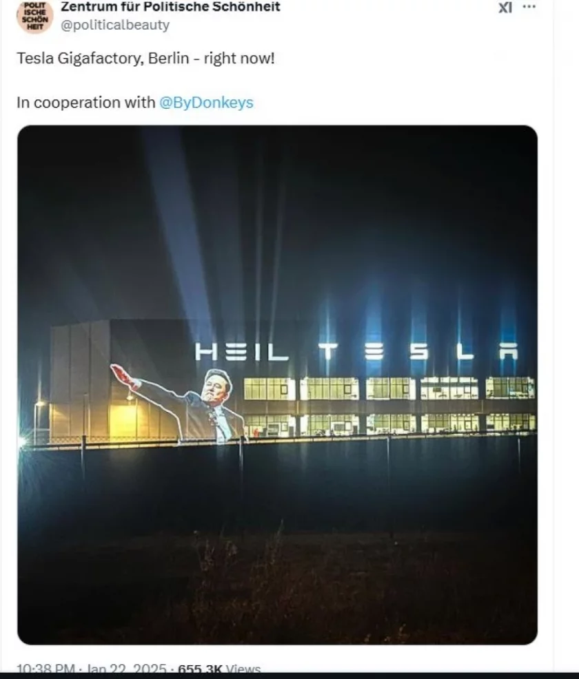 Илон Мъск не пада по тил. Вълната от гневни реакции по целия свят след нацисткия му привет не го развълнува изключително, само че в този момент може и да има друго развиване. Светлинно изображение със скандалния жест на милиардера изгря върху фасадата на завода на Tesla в Берлин, който е благосъстоятелност на Мъск.