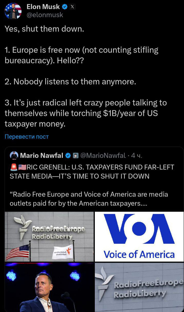 Илон Мъск прикани с обява в " Х " да бъдат затворени " Свободна Европа " и " Гласът на Америка ".