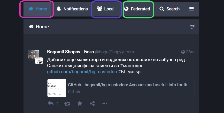 Home - известия, написани от персонално подбрани, следвани хора - това, което нормално се вижда при влизането в Twitter,Local - всички известия на членовете на канала X, в това число на тези, които персонално вие не следвате;Federated - хаосът в деяние... това е река от известия, написани от консуматори в канали Y, Z и други, които са следвани от членовете на вашия канал X.