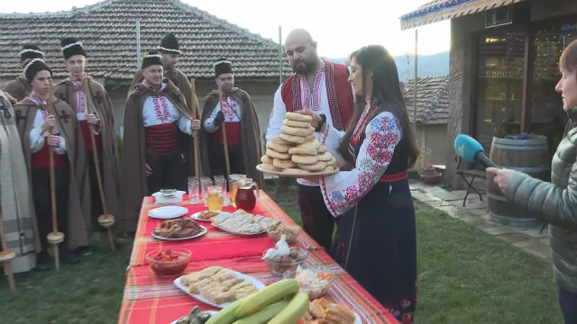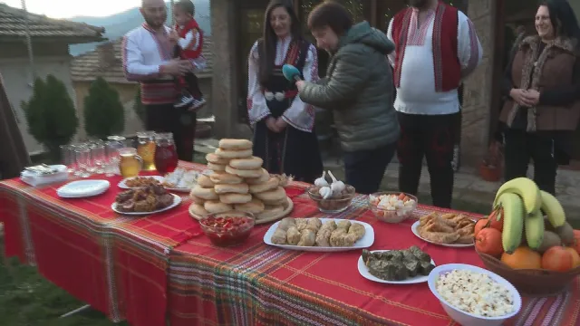 Семейство Ангелови са подредили трапезите от сутринта, а в дома им пристигнаха коледарите. Посрещат ги с кравайчета и вино.
