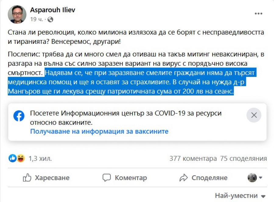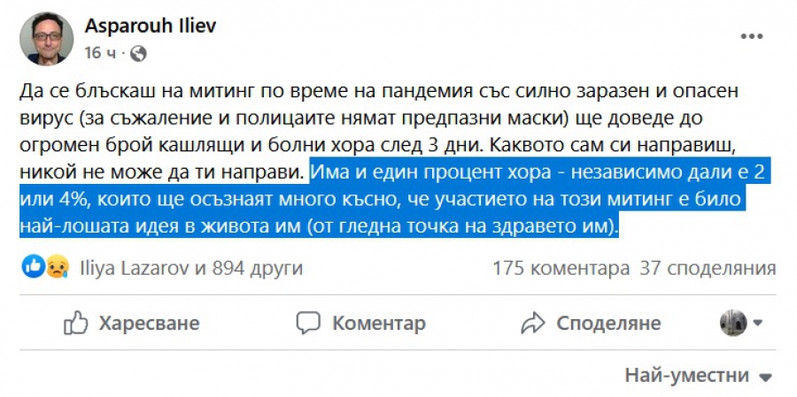 " Има и един % хора - без значение дали е 2 или 4%, които ще осъзнаят доста късно, че присъединяване на този протест е било най-лошата концепция в живота им (от позиция на здравето им). Надявам се, че при заразяване смелите жители няма да търсят здравна помощ и ще я оставят за страхливите. В случай на потребност доктор Мангъров ще ги лекува против патриотичната сума от 200 лева на сеанс ". Това написа в две обособени изявления във Facebook доктор Аспарух Илиев, началник на лаборатория по въпросите на мозъчните инфекции към Университета в Берн.