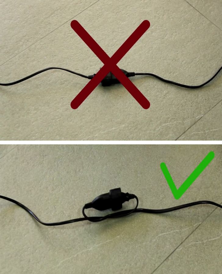 За да се уверите, че зареждането няма инцидентно да се изключи, завържете дребен възел при щепсела.