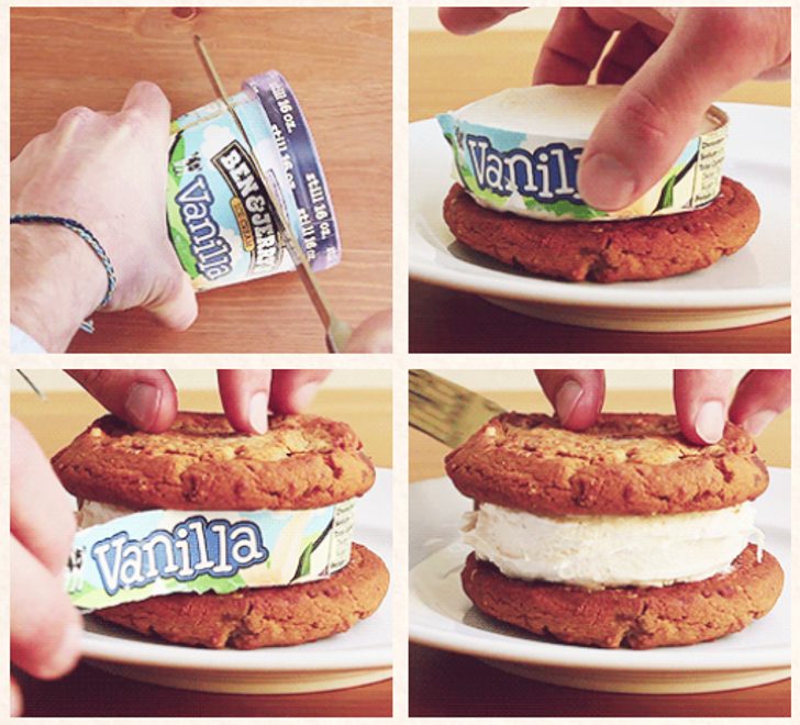 Отрежете филилйка от кутия цялостна със сладолед, поставете резенчето върху бисквитка и от горната страна поставете друга бисквитка. Готово!