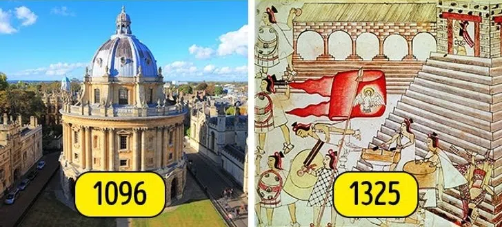 Теночтитлан, град-държава на ацтеките, е издигнат към 1325 година Оксфордският университет няма ясна дата на учредяване, само че образованието е съществувало там през 1096 година Между другото, в лаборатория в Оксфорд има камбана, която звъни непрестанно от 1840 година