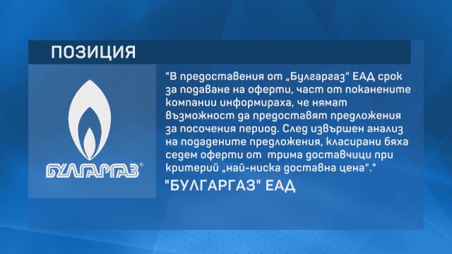 „ В предоставения от „ Булгаргаз " период, част от поканените компании осведомиха, че нямат опция да дават оферти. Класирани бяха седем предложения от трима снабдители при аршин „ най-ниска доставна цена ", оповестяват от „ Булгаргаз “.