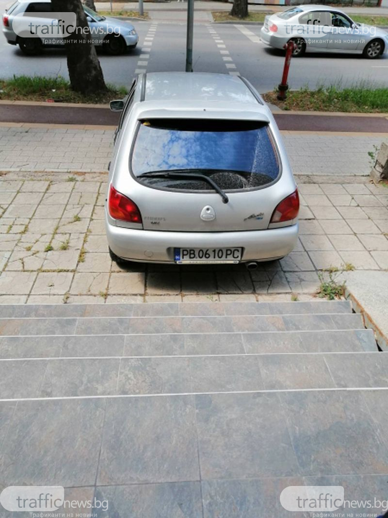 Водачът е минал през велоалея, спрял на тротоар и блокирал достъпа до пешеходна пътека. Но забележете – багажникът му е на по-малко от метър от стълби, които водят към вход на постройка. Удобството в тази ситуация на един е по-важно от това на всички останали.
