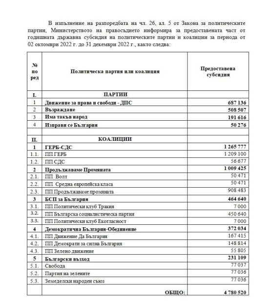Държавата е превела на партията на Слави Трифонов цялата полагаща ѝ се сума от 191 616 лв., която е за интервала октомври – декември 2022 година.