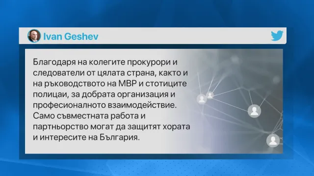 „ Благодаря на сътрудниците прокурори и следователи от цялата страна, както и на управлението на Министерство на вътрешните работи и стотиците служители на реда, за положителната организация и професионалното взаимоотношение. Само взаимната работа и партньорство могат да защитят хората и ползите на България “, написа основният прокурор Иван Гешев в Туитър.