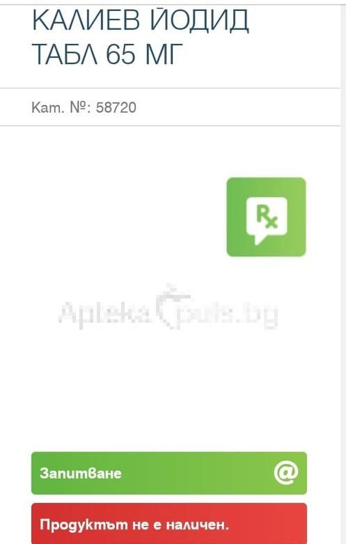 В момента по аптеките се продава калиев йодид на прахуляк (кристали), който е за външна приложимост, както и под формата на капки за очи. Кристалите костват 18-20 лева за опаковка от 50 гр., а капките – 8-10 лева Има и йодова тинктува – разтвор от 5% коства 1.50 лева Но тя също е за външна приложимост – за обработка на кожата към рани. Единственият вид под формата на таблетки в аптечната мрежа е йод от водорасли. Той коства 7-8 лева, само че фармацевтите изясняват, че действието му не е същото като на калиевия йодид.