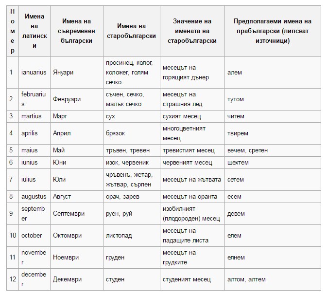 Имената на месеците, които използваме през днешния ден, са пристигнали от латински и наподобяват на тези, които се употребяват в множеството европейски езици. Това е станало с одобряването на общ календар. В предишното българите употребявали и други наименования за месеците. Някои от тях са свързани с най-характерния за месеца празник, а други с измененията във времето и природата през този интервал на годината: