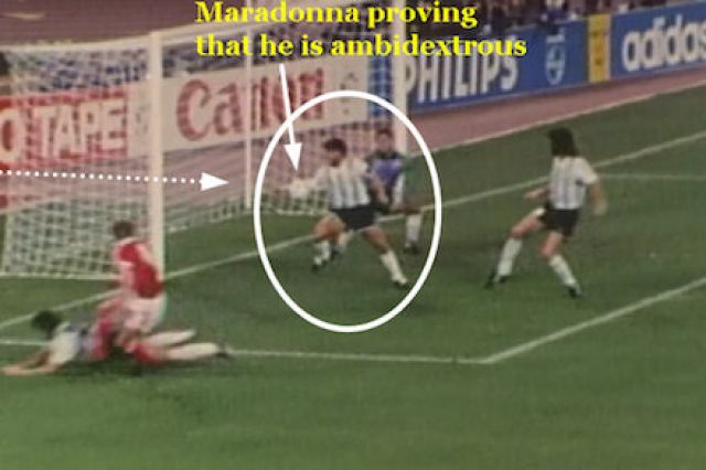 Иначе Дон Диего употребява ръката си и на Мондиал 1990, когато в мача против Съюз на съветските социалистически републики спря влизащата в мрежата топка и съдиите отново не видяха.