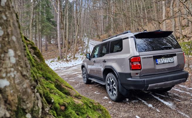 Воланът е нов, с електрическо контролиране. Над мен има панорамен покрив, това значи, че тестовият автомобил е топ равнище на съоръжение Luxury. Салонът е кожен. На таблото имаме меки на досег материали, само че долната му част е с от по-твърда пластмаса. Но там, където коленете ви вършат контакт с пластмасата, тя е облицована с мек материал, с цел да не натъртите коленете си при офроуд.