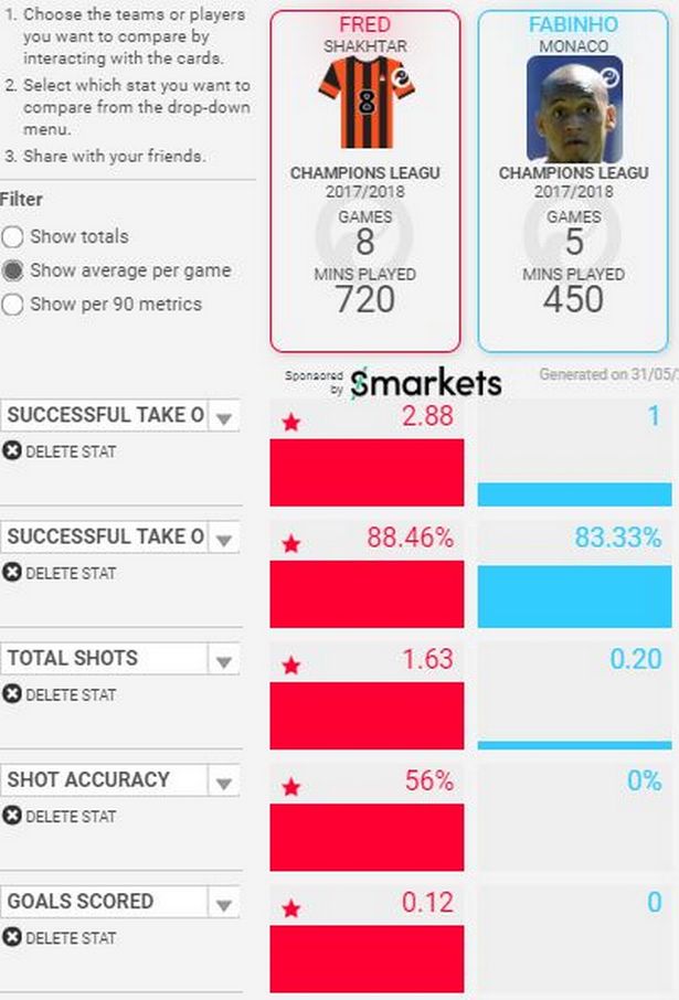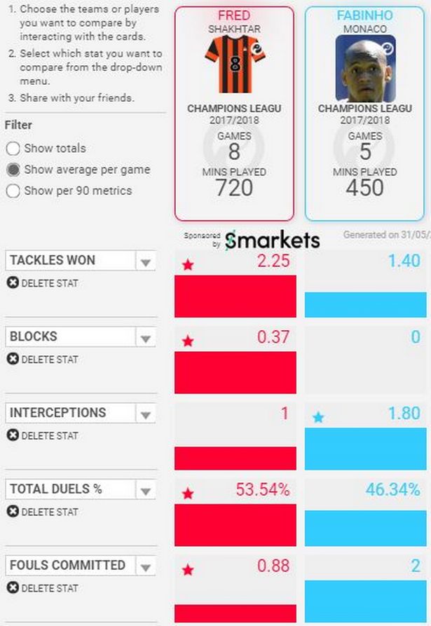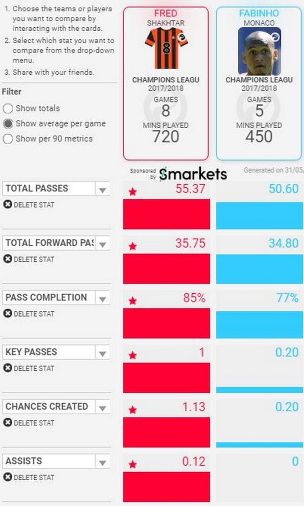 А и цифрите – от анализите на Sqwawka – не лъжат. В последното издание на ШЛ защитните индикатори на Фред са по-впечатляващи от тези на неговия съотечественик. Той има повече шпагати и блокирани удари, като прави приблизително съвсем по един шпагат повече на мач и печели 7% повече от своите единоборства. Разбиваческите качества на Фред бяха от основополагащо значение за това украинският тим да излезе от доста сложна група, съдържаща противници като Манчестър Сити, Наполи и Фейенорд.