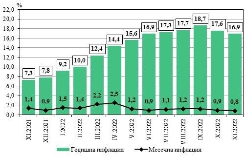 През ноември 2022 година месечната инфлация е 0,8% по отношение на предходния месец, а за ноември 2022 година по отношение на ноември 2021 година е 16,9%.