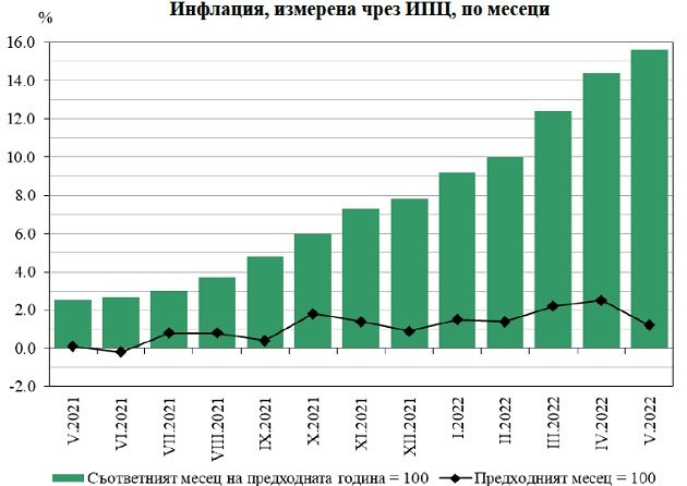 Индексът на потребителските цени за май 2022 година по отношение на април 2022 година е 101.2%, т.е. месечната инфлация в България е 1.2%., демонстрират данни на Национален статистически институт. Инфлацията от началото на годината (май 2022 година по отношение на декември 2021 г.) е 9.1%, а годишната инфлация за май 2022 година по отношение на май 2021 година е 15.6% за страната.Средногодишната инфлация за интервала юни 2021 – май 2022 година по отношение на интервала юни 2020 – май 2021 година е 8.1%.