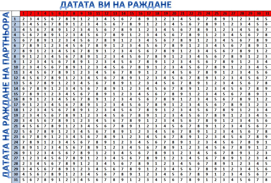 Таблица показва Индекса на съвместимост на партньорите според рождените им дни