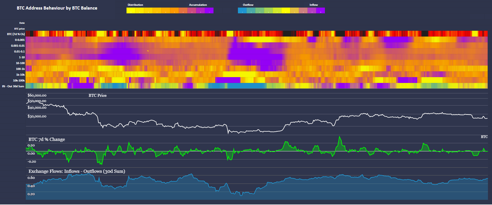 Ярък индикатор за това закъснение е общата относителна смяна в портфейлите, притежаващи Биткойн за интервал от 30 дни. Макар че портфейлите към момента записват растеж, темпото е отслабнало, изключително измежду притежателите на 10 – 10,000 BTC. Тези по-големи групи са склонни да оказват по-съществено въздействие върху динамичността на пазара.