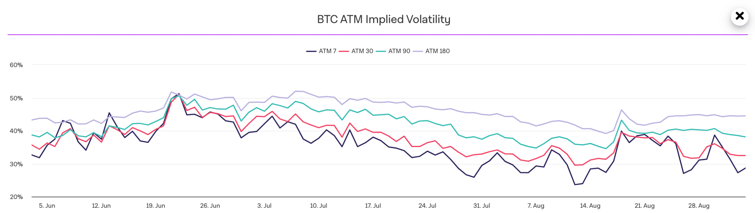 Освен това хипотетичната волатилност на Биткойн е намаляла през последните няколко месеца. Имплицитната волатилност мери прогнозите на пазара за бъдещи съмнения на цените. Намаляването на хипотетичната волатилност демонстрира, че търговците чакат фаза на ценова непоклатимост или предвидимост.