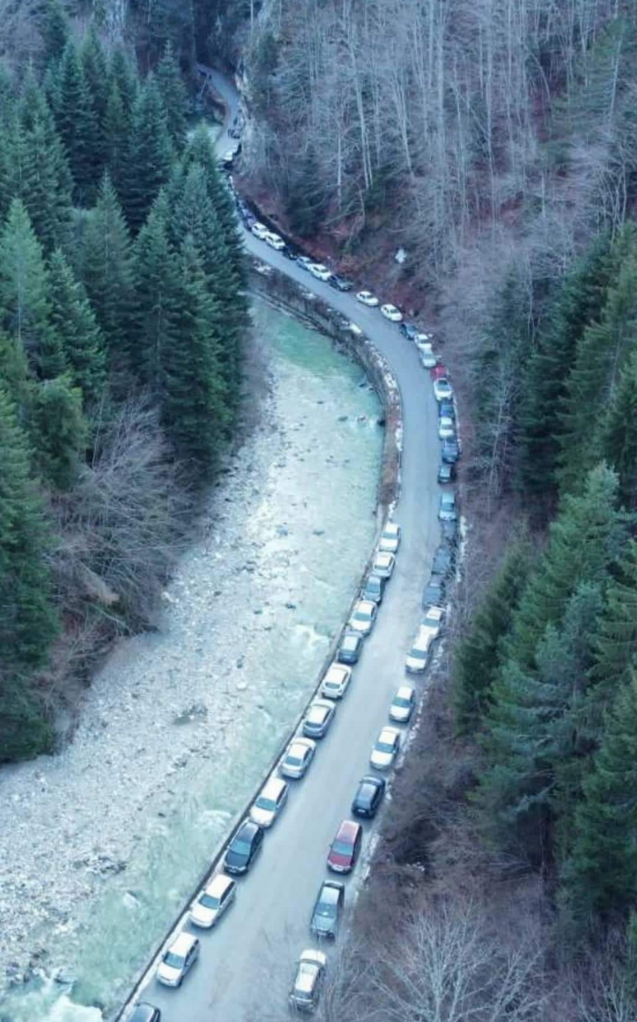 (Снимката е направена с дрон от Иван Гътев - километрична бе колоната от коли, паркирани от двете страни на тесния участък)