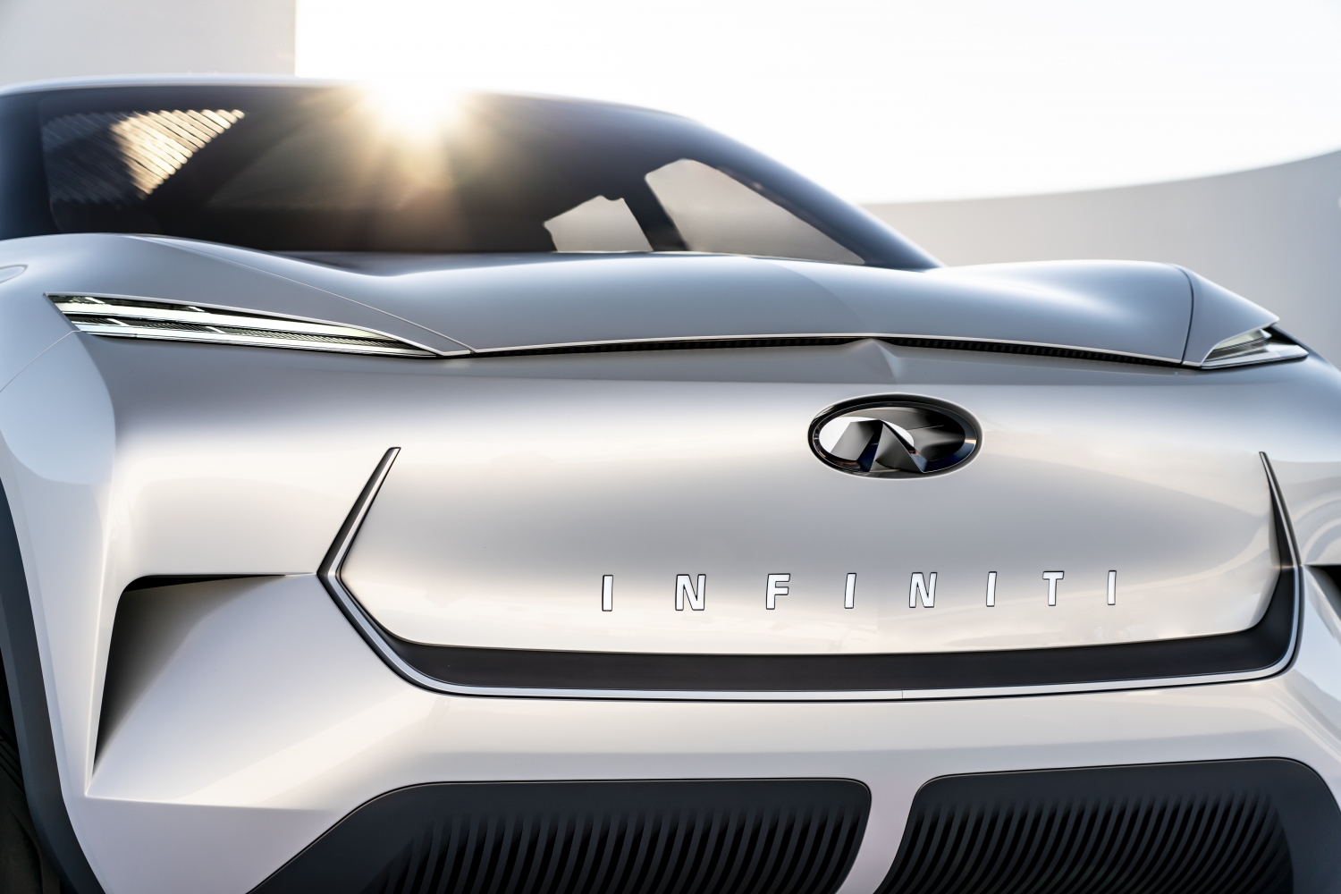 Въпреки отпадането на нуждата от огромна предна решетка за изстудяване на мотора, QX Inspiration резервира форми, които биха дефинирали точно отвор за въздух. Гладките повърхности заменящи решетката в него са маркирани от светещ надпис с логото на Infiniti, а тесни канали водят въздуха към каросерията. Близък взор към предните светлинни ленти откриват наподобяващи лазер графики, с високотехнологичен рисунък, който има своите отблясъци в интериора и външността. Този рисунък се придвижва и в задната част в светлинните ленти с криловидна форма разпростряли се по целия похлупак, добавяйки ясно изразен очертаващ силует в задната част на автомобила.