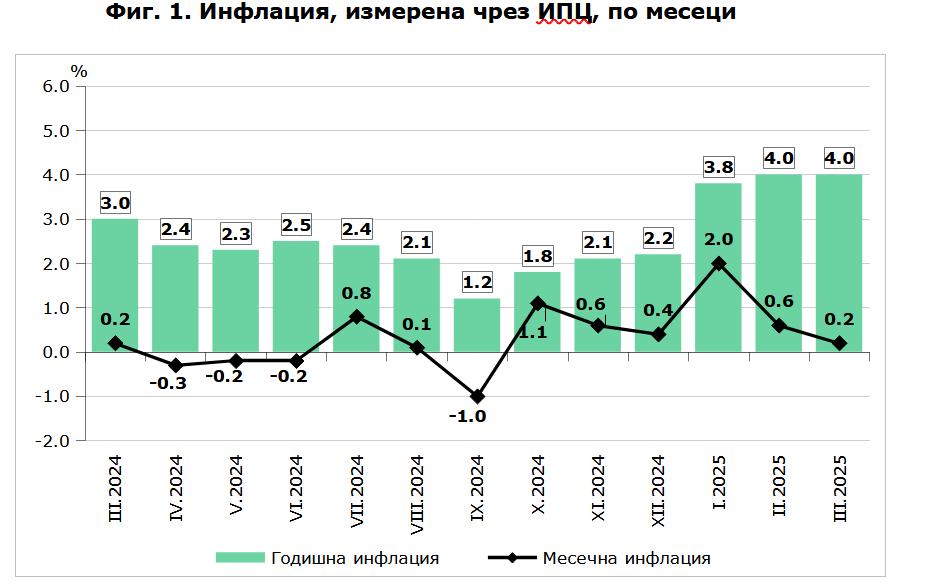 Инфлацията през март порасна с 0.2% и на годишна база към този момент е 4%, демонстрират данните на Национален статистически институт.