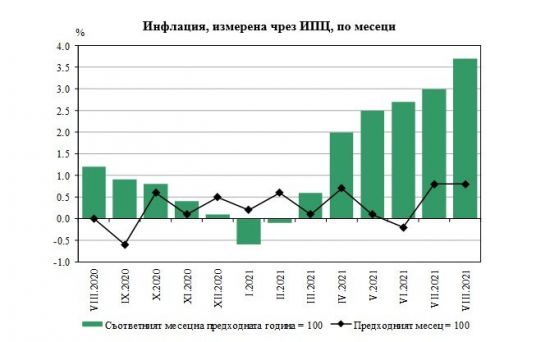 Инфлацията у нас продължава да пораства. Месечната за август е 0.8%, от началото на годината е 3.1%, а годишната (август 2021 г.-август 2020 г.) - 3.7%, по данни на Националния статистически институт.