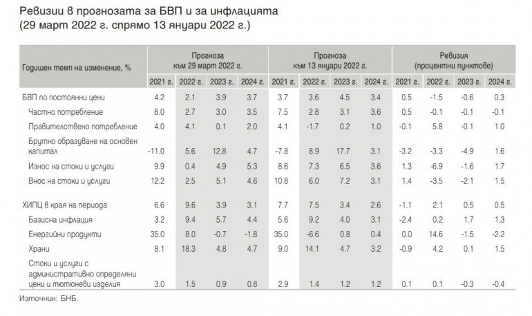 Базисният сюжет на Българска народна банка планува растежът на брутния вътрешен артикул (БВП) на страната през 2022 година да се забави до 2,1%, при предстоящ растеж от 3,7% в предходната прогноза от декември. По-малкият растеж на стопанската система ще се дължи на по-малко нарастване на потреблението и на стесняване на износа, изясняват експертите.