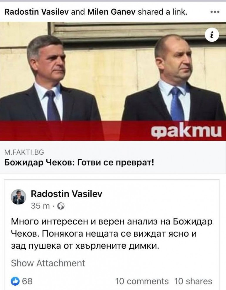 Интересен коментар на писателя Божидар Чеков във фейсбук е провокирал интерес и у оферти за състезателен министър от Има Такъв Народ Радостин Василев. Написаното от Чеков със заглавие „ Готви се прелом “ е препечатано от уеб страницата „ обстоятелства “ и илюстрирано със фотографията на Румен Радев и служебният министър председател Стефан Янев. „ Мното забавен и правилен разбор на Божидар Чеков. Понякога нещата се виждат ясно и зад пушека от хвърлени димки “, написа Василев. Ето и цялостният коментар на Чеков, който той е разгласил във фейсбук страницата си: След два следващи вота политическата пукотевица по стълбите на Народното събрание става се по-яростна, само че вместо светлина, става все по-тъмно. Иво Прокопиев предсказва нови избори, с вярата " ДА България " да ги завоюва, нещо което никой от " десницата " повече не има вяра. Партията " ИТН " събра най-вече гласове в България и в чужбина, тъй като няма нищо общо със статуквото, нищо общо с " обръчите " и " кръговете ", които задушават страната. Заслугата, че те първи и единствени биха ГЕРБ, не бе удостоена с почестта, която заслужава. Вместо това " партиите на митинга " не стопираха да се подиграват с тяхната неумелост, неприятен усет и даже външен тип. Вярно е, тези нови и непредвидени " спечелили " не се демонстрираха изключително благоразположени към искащите да работят с тях. Самият Слави Трифонов, правилен на уговорките си, отхвърли изрично всевъзможен опит за правене на обединения. Преломната точка в този неофициален анти ГЕРБ съюз настъпи, когато Христо Иванов разбра, че в бъдещето държавно управление на " ИТН ", няма да има място за него. Подигравките се трансфораха в тиня, а намеците в обиди. В медийния поток от мръсотия до " десния " " Капитал " се подреди и " левия " " Сега ". Сашо Дончев, на скромния интернационален панаир " Трите морета ", продаде " Овергаз " на една американска компания и неналичието на еластичност на момчетата от " ИТН " се трансформира в опасност за неговите бъдещи проекти. И освен на него! " Преврат " се назовава опита да се отклони по всевъзможен начин, мнението на гласоподавателите и да им се натрапи друго. Подобен опит проработи в България, след успеха на " ИТН ". Малки и огромни ползи се почувстваха застрашени. След оплюването или дискредитирането на всеки един неин представител, стартира политическа блокада, която да им попречи сформиране на държавно управление. Обидена " ДА България " пусна изтъркания слух за " Турската заплаха ". Слух с помощта на който Каракачанов натрупа много парцели, някой от които с " Три тераси ". Трябваше да се попречи непременно Движение за права и свободи да поддържа новото държавно управление. Единствена Корнелия Нинова заприказва рационално за търсене на съглашение, тъй като при едни нови избори, пътя на Герб към властта още веднъж се отваряше. Часове след нейното изявление, служебният министър ръководител - военачалник Стефан Янев се появи на телевизионните екрани, с цел да даде някакъв урок по народна власт, който може да бъде тълкуван като аргументиран предстоящ прелом. " Политическите процеси не протичат в нормалната си демократична логичност "?!- съобщи министър председателят, преди да продължи " Гражданите имат право да знаят, кой дефинира постовете в новия кабинет! " Интересна забележка от човек, който е назначен, а не определен и у