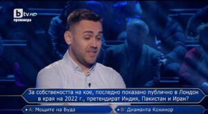 Той бе „ За собствеността на кое, последно показано обществено в Лондон в края на 2022 година, претендират Индия, Пакистан и Иран? “ Опциите тук бяха „ Мощите на Буда “, „ Диаманта Кохинор “, „ Скиптъра на Далай Лама “ и „ Първия дубликат на Библията “. Петрушка поразсъждава за всяка една от тях, а най-после се спря на втория отговор, който се оказа правилен.