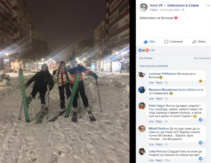 На нея трима запалянковци са се екипирали за планина, поставили са си ските, само че вместо да се качат в планина Витоша, те са отишли на централната пешеходна улица в София, известна като Витошка.