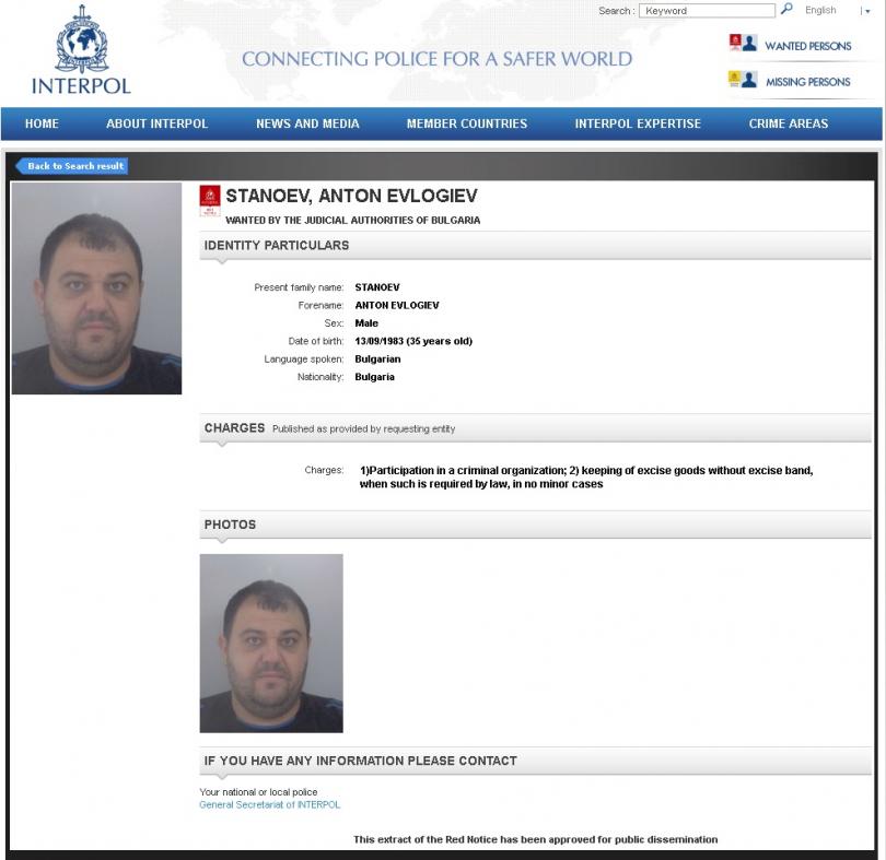 Интерпол търси Антон Станоев, по прякор Бирмата, с алена бюлетина, демонстрира информация на уеб страницата на Интерпол.