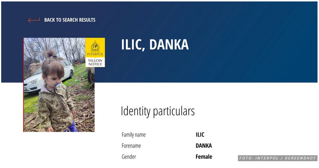 Интерпол разгласи интернационално търсене на изчезналата двегодишна Данка Илич от Сърбия, заяви сръбската редакция на Радио Свободна Европа (РСЕ). На уеб страницата на интернационалната полицейска организация бе оповестена фотография на момиченцето с изложение.