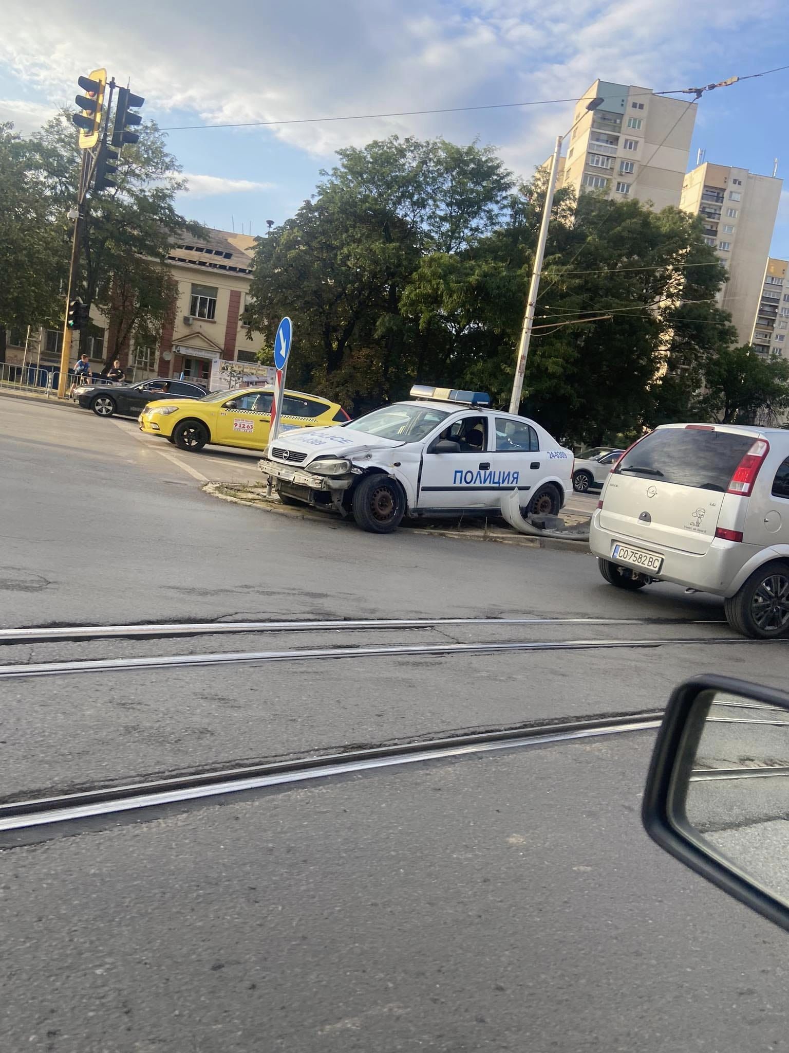 Инцидент сред патрулен автомобил и трамвай е станал на бул. " Никола Мушанов " и бул. " Възкресение ".