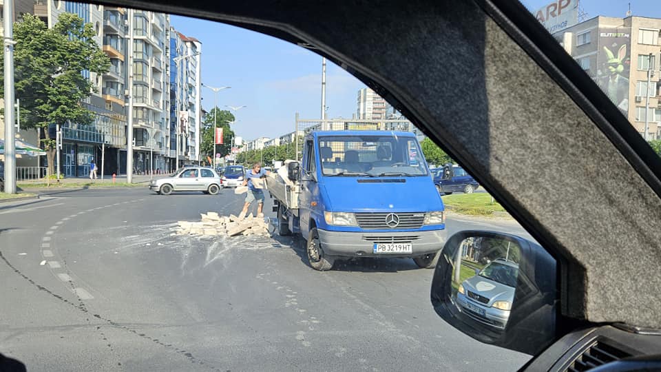 Камион е разпилял строителни материали в кръговото кръстовище до Панаира, по бул. „ България “.