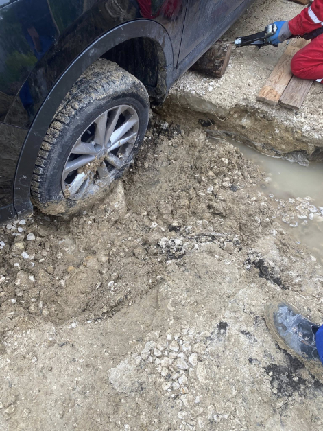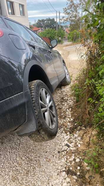 От оповестените фрагменти се вижда по какъв начин автомобилът ѝ безусловно е пропаднал в профил на пътя в разкопан сектор, цялостен с тиня, вода и незасипана яма. Задната гума на колата виси във въздуха, което основава заплаха освен за транспортното средство. На друга фотография се вижда самата яма, евентуално оставена от екип на ВиК, без никакво предизвестие или обезопасяване.