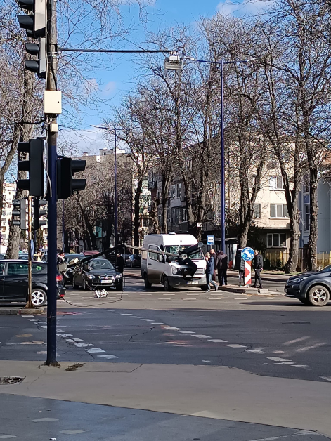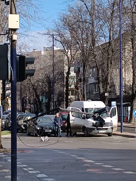 Светофар се стовари върху бус на кръстовище в Пазарджик СНИМКИ