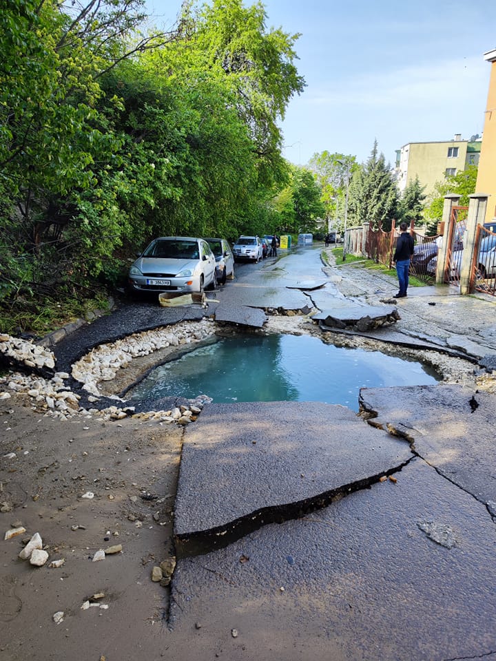 (ОБНОВЕНА 9:38 ч.) Към този миг водата, бликаща от улицата, е спряна. Асфалтовата настилка е нарушена, като се е образувала голяма дупка.