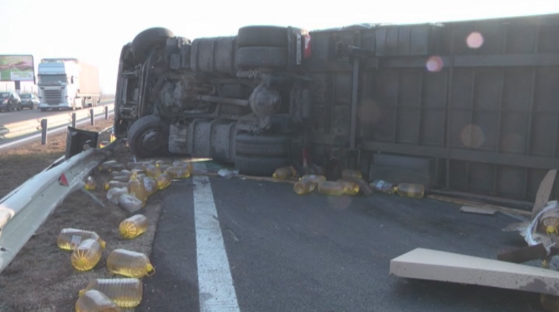 Инцидентът е станал малко след 7 часа тази заран. Шофьорът на камиона с ремарке изгубил надзор над ръководството, влезнал в канавката, след което се преобърнал. Част от товара - десетлитрови бутилки с олио, са разпилени по пътното платно.