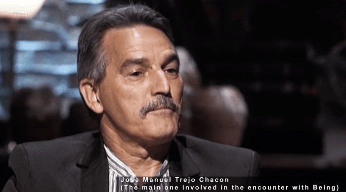 Няколко пъти бойците викат, само че никой не дава отговор. Докато Хосе Мария Трехо не усеща, че някой го следва. На 15 метра напред двамата виждат зеленикава светеща фигура, висока към 3 метра, с дребна глава и чудноват шлем. Непознатият има дебело тяло и дълги ръце.