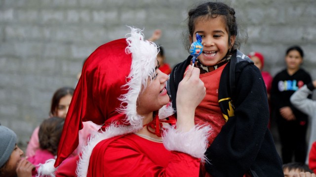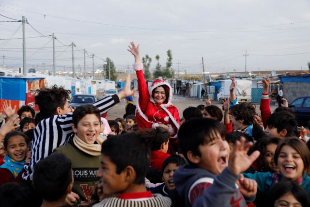 Иракчанка, облечена като Дядо Коледа, зарадва разселени деца
