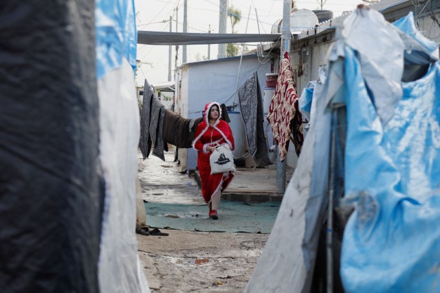 Иракчанка, облечена като Дядо Коледа, раздаде дарове на разселени деца в лагера Бахарка в Ербил, заяви Ройтерс.