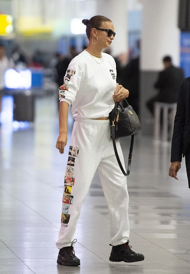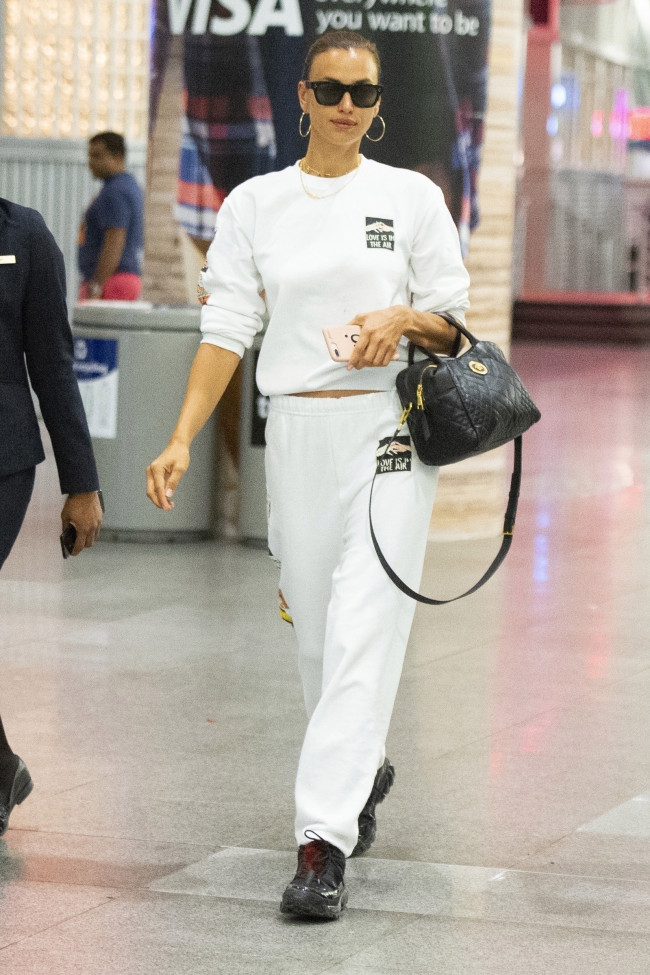 Бившата другарка на футболната суперзвезда Кристиано Роналдо беше облечена напълно в бяло, като заложи на състезателен жанр. Красавицата носеше бял суитчър на стойност 50 $ и същия панталон за 55 $. Надписът на облеклата пък гласеше „ Любовта е във въздуха “.