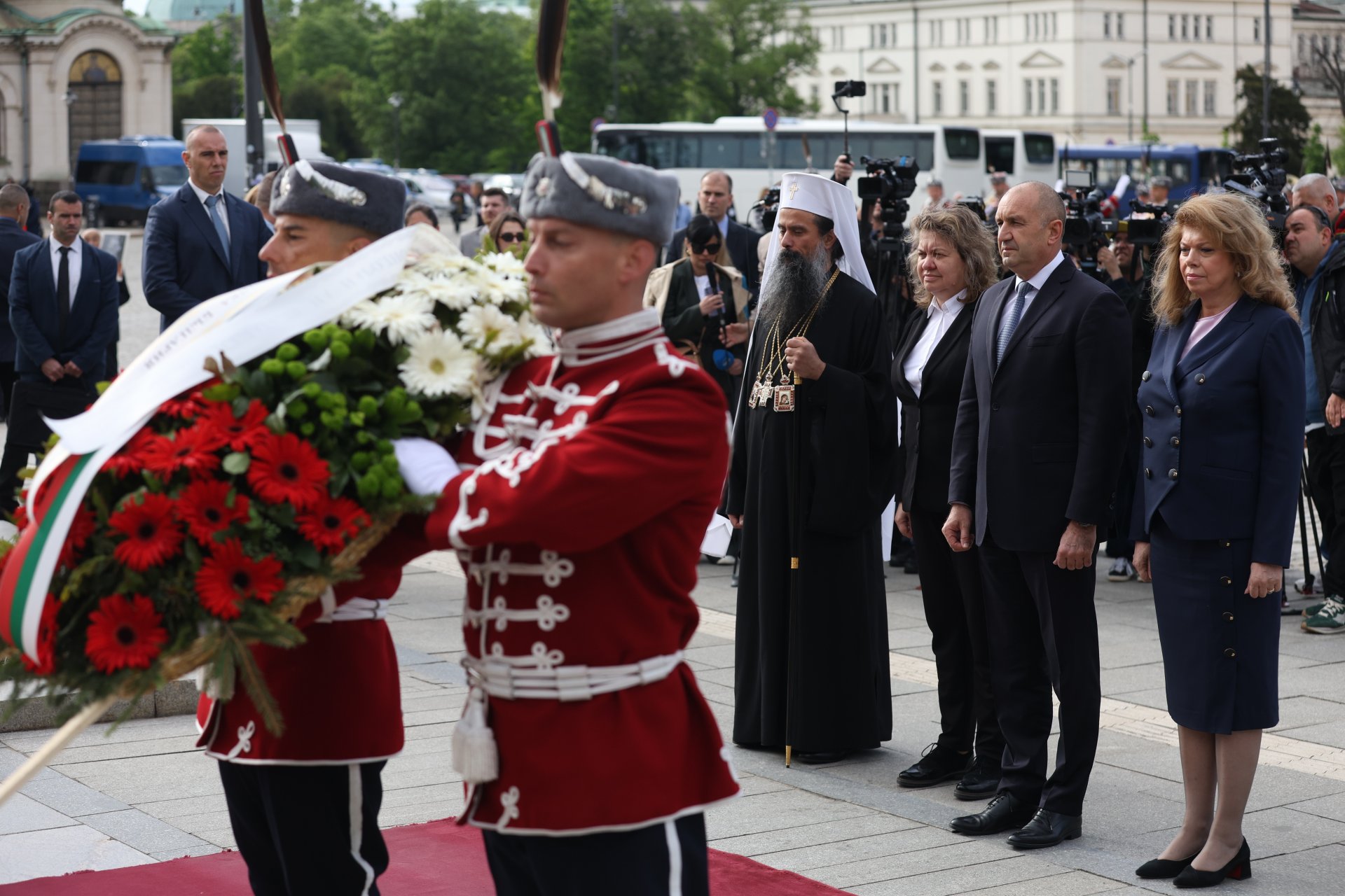 Президентът приказва пред публицисти пред Паметника на Незнайния боец в София, откакто сервира цветя по мотив Деня на Европа и Деня на победа над фашизма, дружно с вицепрезидента Илияна Йотова, с ръководителя на Народно събрание Наталия Киселова и с българския патриарх Даниил.