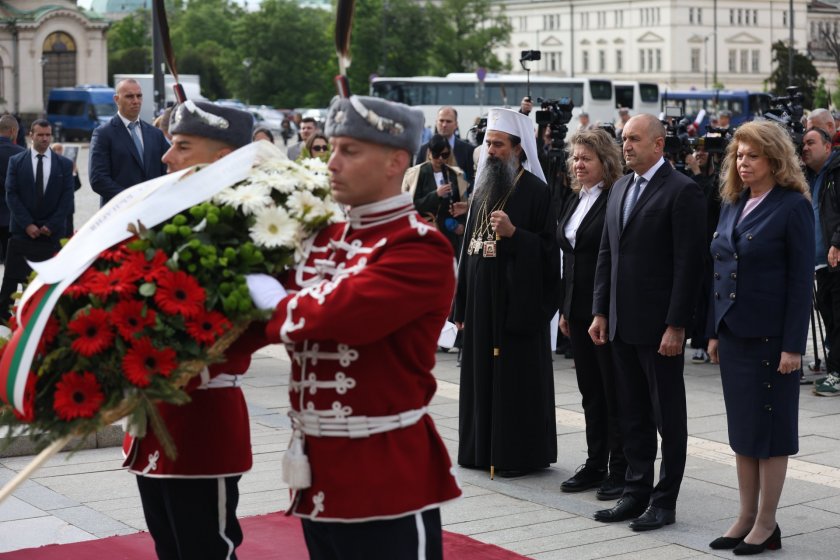 Президентът приказва пред публицисти пред Паметника на Незнайния боец в София, откакто сервира цветя във връзка Деня на Европа и Деня на победа над фашизма, дружно с вицепрезидента Илияна Йотова, с ръководителя на Народно събрание Наталия Киселова и с българския патриарх Даниил.