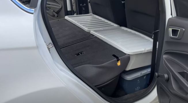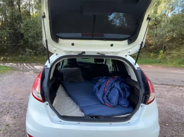 Върху това той сложи брезент за образование, постеля за къмпинг и спален чувал, създавайки спонтанна спалня в задната част на колата. Багажникът също е напълнен от дървената дъска, с цел да работи като бюро, кухненски плот и място за готвене.