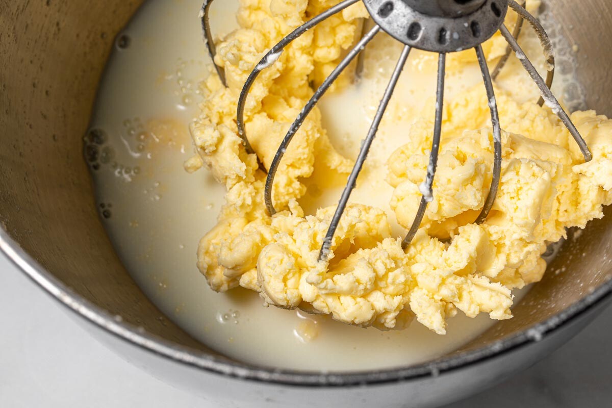 Юлия Мулино След леко втвърдяване увеличете скоростта на оптималната и разбивайте за към 7 минути. Ще забележите, че сметаната ще стане твърда – това е маслото. А в купата се появява течност – това е мътеницата.