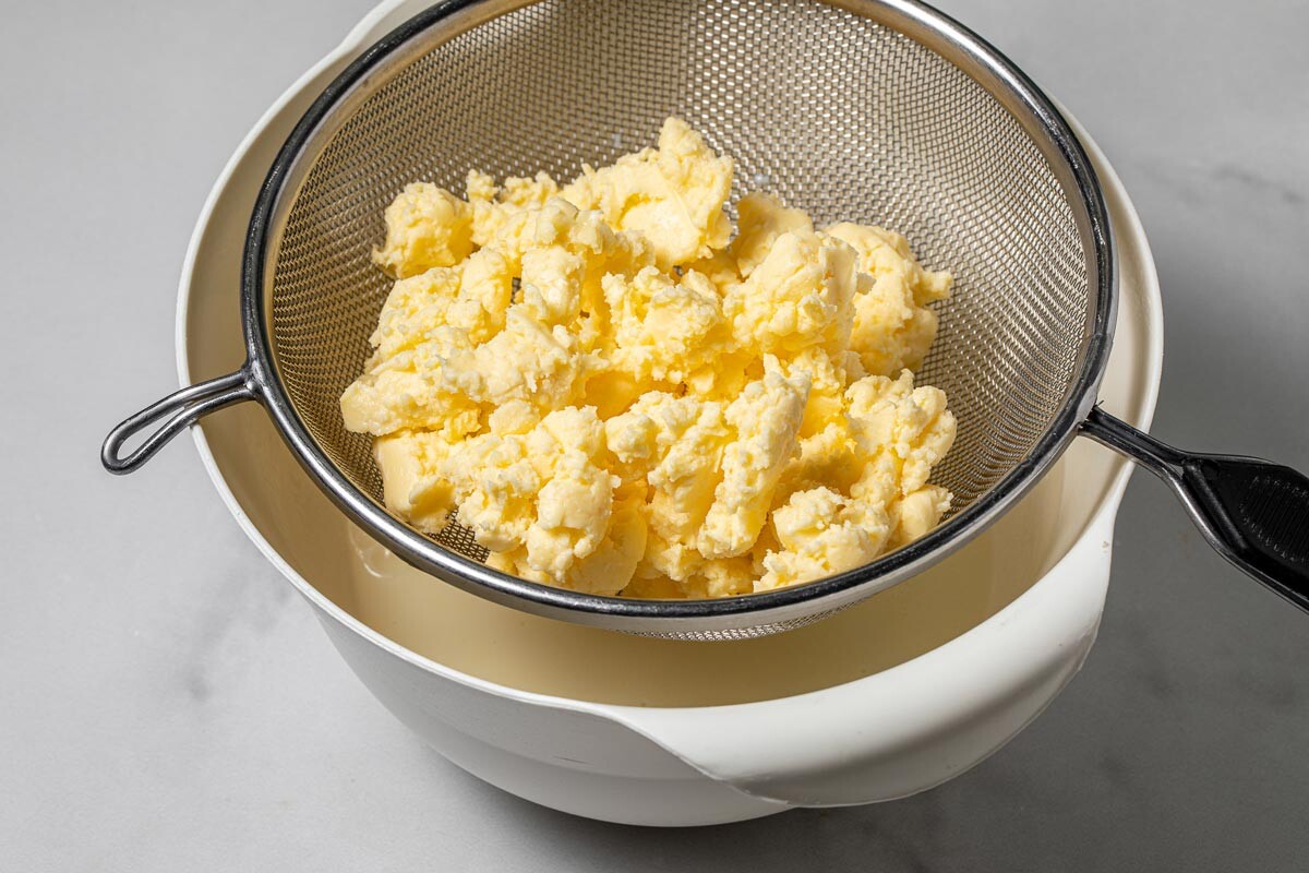 Внимателно прецедете наличието на купата върху тънко решето. Не раздробявайте маслените трохи – по този начин ще бъде по-лесно да се изплакнат. Задръжте ситото с маслото под студена течаща вода, с цел да се освободи мътеницата.