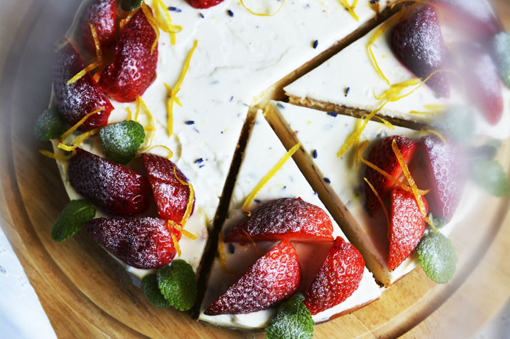 Искате ли да се насладите на кремообразен, лек и тънък като чийзкейк десерт, подготвен без водна баня, без бисквитен пласт, без лутане? Ако в действителност желаете, днешното ми предложение е за вас - лесна и доста ефектна торта от извара, която може да поднесете с пудра захар, бита сметана, плодове или сладко. Използвах 500 г извара, 2 яйца, 150 г захар, 30 г картофено нишесте или царевично нишесте, 60 мл готварска сметана, кора и сок от 2 лимона. Как я направих: В купа комбинирах захар, яйца и нишесте. Размесих добре, тъй че да няма бучки. Добавих извара, сметана, кора и сок от лимоните. Разбърках до гладкост. Изсипах в намаслена и поръсена с брашно 22 см кръгла форма и изпекох на 170 С за към 45 - 50 минути. Върху охладената торта разнесох великодушен пласт от извара и сметана, овкусени с мед. Поръсих с лавандулови пъпки, лимонова кора и сервирах с ягоди и мента.