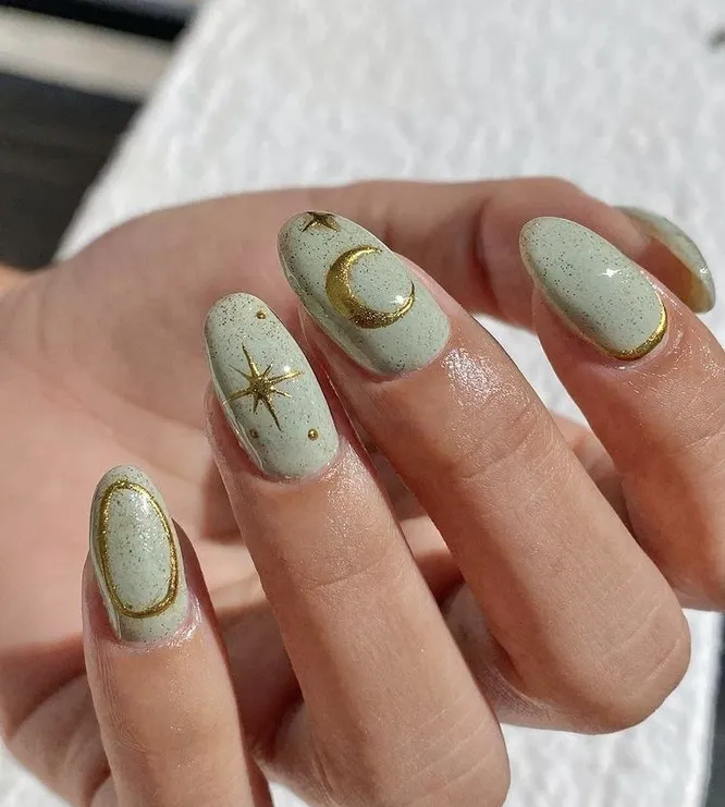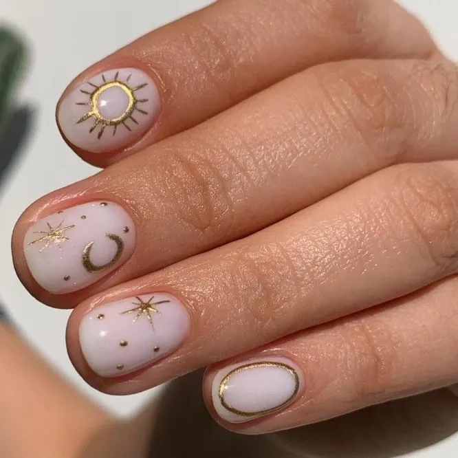 Бялата основа и златните детайли постоянно са символизирали непорочност и жанр. Тук всеки подробност прилича астрологични знаци: слънцето, луната и звездите. Всичко наподобява минималистично, само че поради златното маникюрът придобива даже лъчение като на украшение. Този дизайн ще подхожда на тези дами, които обичат семплата визия, само че желаят и малко искра.